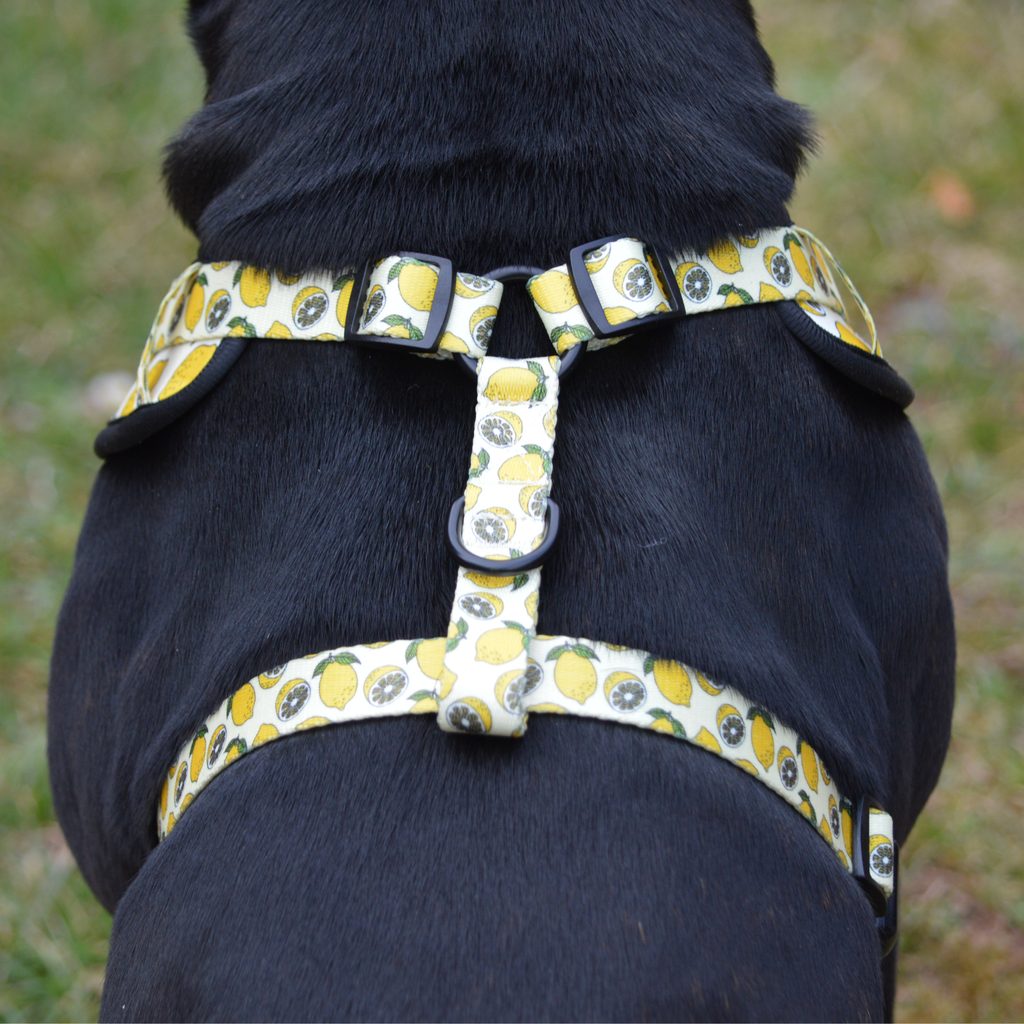Designos hám kutyának, Reedog logóval a hám mellkasi részén. Citrom motívummal díszített, könnyű és légáteresztő anyagokból készült. Kényelmes szabású és kialakítású, nem húzza a kutya szőrzetét és nem dörzsöli négylábú kedvencét. Ami a legfontosabb, hogy nem terheli a kutya nyakcsigolyáit és gerincét. A hámhoz csatlakoztatható póráz.